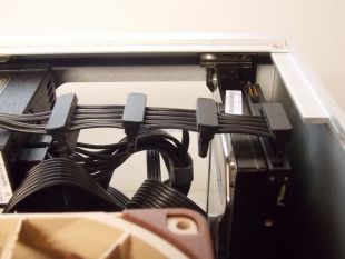 Ponendo l'hard disk da 3.5" verticalmente non è altrettanto possibile alimentarlo per via dell'altezza dello stesso, data la presenza della scheda madre nella porzione inferiore. Sarebbe stato possibile invece, con una scheda madre mini-ITX, installare i dischi lateralmente in posizione verticale, similmente a quanto fatto nella porzione sinistra del case, lato PSU.