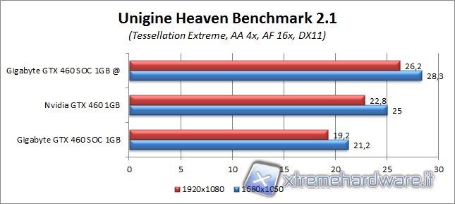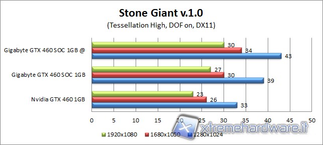 Come ci si aspettava sono due benchmark molto pesanti, ed i frame rate non sono elevatissimi, ma anche in questo caso notiamo un distacco netto tra la soluzione reference e quella di Gigabyte